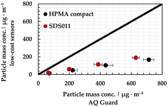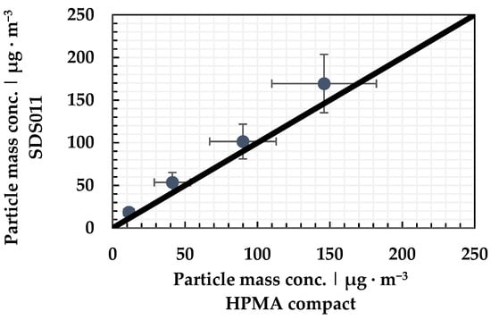 The particle mass concentrations (PM2.5) are measured with the low-cost sensors: SDS011 and HPMA compact. In Figure 4, the results for NaCl aerosols produced from NaCl solutions of four different concentrations up to 1.0 g·L−1 in the disperser are shown. Each data point results from repeated measurements, with three samples from each sensor and multiple measurements of each (a total of at least nine). The PM10 values are not plotted as they are identical to the PM2.5 values. This observation is consistent with the measurements of the PSD (Figure 3), which does not contain any particles larger than 2.5 µm.