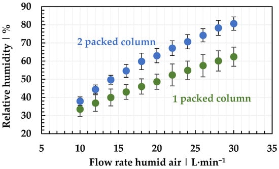 Relative humidity depending on the flow rate of the humid air (D), at a constant NaCl (C) aerosol flow of 4 L·min−1, using a single column or two in series.