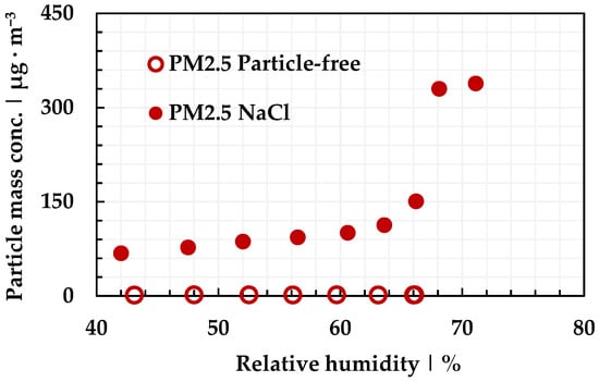 The results for the particle-free air clearly show that the humidity has no impact on the measurement of PM values. At a constant volume flow with varying humidity, no particles are detected. Consequently, condensation on the detector or in the measuring volume can be excluded as well. Under identical conditions, the results with the conditioned NaCl aerosol show a correlation between the two parameters, and the PM values increase with increasing humidity (cf. Figure 7). Up to 60% humidity, the correlation is approximately linear, while for higher humidity levels the detected PM rises significantly. Values at 70% are about four times higher than the values at 40%. The reason for this increase in the PM values is the hygroscopic growth of the particles in humid air [58,59]. Initially, the adsorption of water-vapor molecules takes place until the maximum capacity (max. adsorption capacity of the salt) is reached. Then, water-vapor condensation and particle dissolution occur (solubility point), which leads to a growth process, and the solid particle becomes a droplet [60]. With the change in size, the optical properties of the particles also change—for example, their interaction with light [61].
