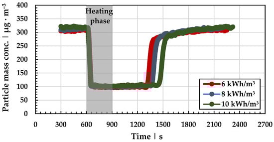 The recorded PM2.5 value before the heating corresponds to the data from Section 3.2. A significant abrupt drop in PM2.5 can be observed after starting the heating process, after which the value remains at a constant level. Further heating no longer influences the particle concentration. After the heating element has been switched off, the PM value is still the same as previously and remains constant for a period of time. Subsequently, the PM2.5 value rises again and rapidly returns to its initial value. The time interval between the heating end and PM recovery is hereafter referred to as residence time. Studies on the lower and higher power inputs show the similar behavior of the particle concentrations. The PM2.5 value measured during the heating phase and afterwards is the same in all experiments and remains at approx. 100 µg·m−³. The curves in Figure 8 only differ in the time until the PM drops after the start of the heating process and the duration of the residence time. For low-energy inputs, the influence of the heating appears to be time-delayed, while for higher inputs it occurs nearly instantly. The residence time increases with increasing specific electrical energy.