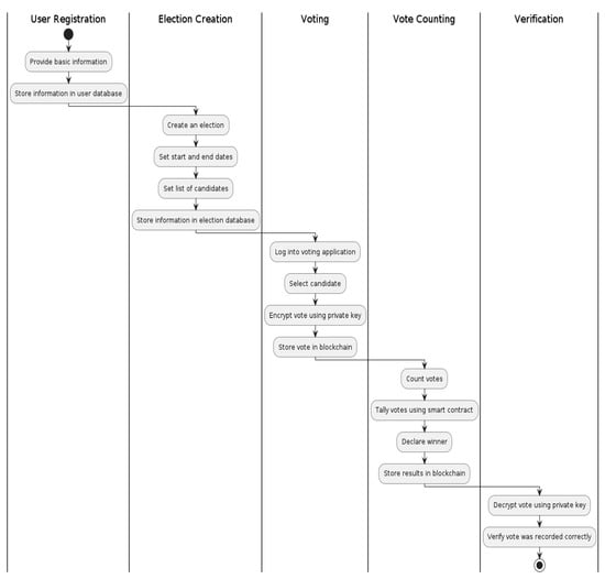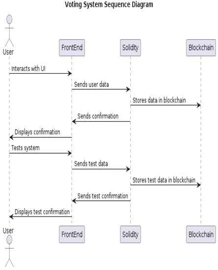 The data flow in a blockchain voting system is designed to be transparent, secure, and tamper-proof. Blockchain technology ensures that the voting process is fast and cannot be manipulated by any individual or group. The system’s transparency allows for easy verification of the results, which helps build trust in voting [8]. Overall, the data flow of a blockchain voting system is a critical component of the system design. It ensures that the system is secure, transparent, and tamper-proof, which are essential for maintaining the integrity of the voting process.