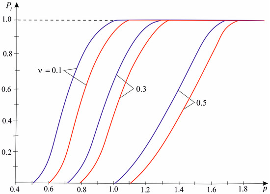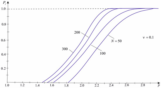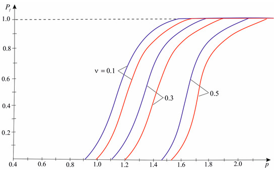 According to Expression (27), Figure 4 demonstrates diagrams of the failure probability under biaxial symmetric compression at a fixed value of Poisson’s ratio for different numbers of inclusions.