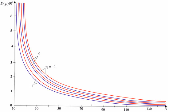 Here, is a distribution parameter with the dimension of the random variable . The physical content of (13) consists of reducing the probability of the quantity presence in case of its increase. In articles [24,25], the study was based on the laws of size distribution of defects during the failure of materials.