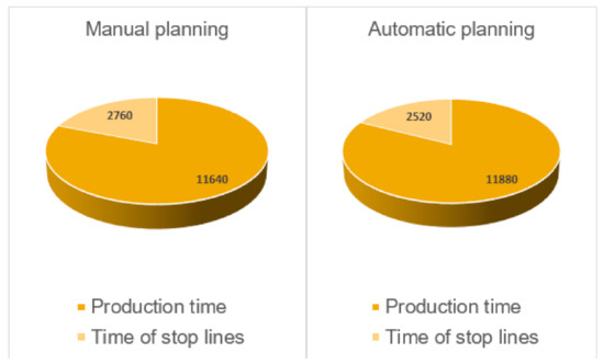 The proposed solution improved production efficiency (Figure 4). The planning algorithm represents a certain initial prototype, which can be further developed. There are specific challenges and general challenges which can be further solved. Specific challenges have been identified for the specific production line where the case study was conducted, general challenges are tied to a generalized planning algorithm. Specific challenges include, for example, the lack of feedback on the production information system or the gray area. The gray zone represents temporarily unregistered products, however, this weakness will be removed with a connection to the information system. This will bring a complete overview of real-time production and additional saved production capacity. General challenges are about extending functionality to users. It can be a development of reports for various company departments, as well as advanced functions for management support in decision-making in risky production situations (failure, lack of material, etc.). For the purchasing department, there can be added functions, that will enable more accurate material planning, thus reducing material stocks. Also, there can be made a module for the maintenance department, which will enable forecasts of line stops for better planning of technical maintenance and engineering changes. The connectivity within the internal information system for faster monitoring of the current production situation seems to be very useful, mainly due to faster response in the event of crises. The proposed planning algorithm represents an increase in production efficiency, almost without financial investment. Of course, further improvements and increases in production productivity can be extended with the application of investments in interconnection with information systems and more detailed product monitoring.