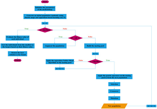 In this section, we broadly describe the underlying algorithms and techniques that are used to design our proposed methodology. Section 2.1 presents an overview of genetic algorithms as a powerful optimization technique. Genetic algorithms are population-based search algorithms that mimic the process of natural evolution to explore the solution space and find optimal solutions. Section 2.2 delves into the Nelder–Mead algorithm, which is a direct search method for optimization. It provides a detailed description of the algorithm’s basic operations, including reflection, expansion, contraction, and shrinkage, to iteratively converge toward the optimum. Lastly, Section 2.3 introduces the opposition-based learning technique, which is a novel concept that enhances optimization algorithms. It incorporates the use of opposite solutions to improve the exploration capabilities and convergence speed.