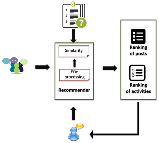 Figure 1 illustrates the recommendation process, which consists in three main steps: first, the query poses by the student in the forum is pre-processed, as well as the repository of past test activities and all posts from past conversations in the discussion forum. Next, the similarity between the query and the different activities and posts is calculated. Finally, activities and posts are ranked according to their similarity to the query. Each step is explained in detail below.