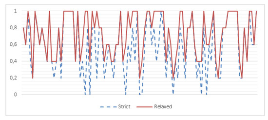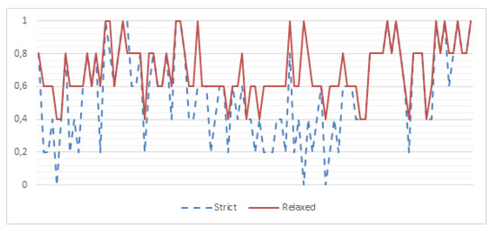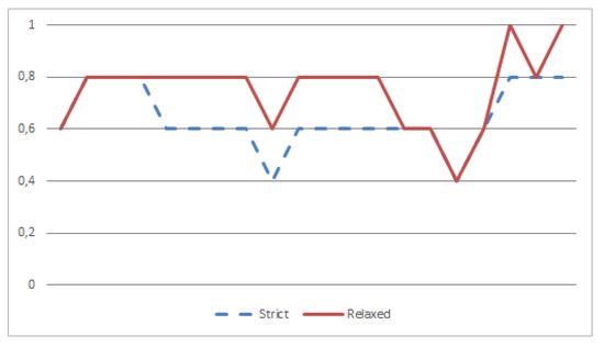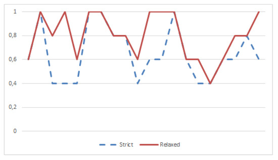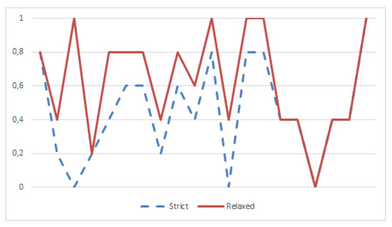 Figure 2, Figure 3 and Figure 4 show, in a graphical manner, the evaluation results for the recommendation of similar posts, when the texts are represented as bags of words, key phrases and word embeddings, respectively. We can observe that, when the evaluation is performed under the “strict” criterion, the differences between the three approaches are not noticeable. In contrast, in the case of the “relaxed” evaluation, the use of the bag of words approach produces poorer results than the other two approaches.