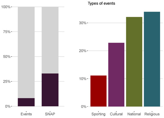 Proportion of days corresponding to events and SNAP (on the left) and distribution of event types (on the right).