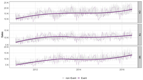 The SNAP is a federally funded initiative in the United States aiming to help individuals and families with low incomes to buy food. It was previously referred to as food stamps and is managed by the U.S. Department of Agriculture. As the largest nutrition assistance program in the nation, SNAP plays a crucial role in providing support for those in need of food assistance. The M5 dataset provides information on the SNAP in each state for each day. When we examine the proportion of days on which Walmart stores permit purchases with SNAP benefits, we observe that it is consistent across all three states: 650 days or 33%. SNAP benefits are available for exactly 10 days each month in all states, and these days occur on fixed dates that are the same for every month in every state. In California, SNAP benefits are available in the first 10 days of the month, while in Texas, benefits are available on the 1st, 3rd, 5th, 6th, 7th, 9th, 11th, 12th, 13th, and 15th days. In Wisconsin, SNAP benefits are available on the 2nd, 3rd, 5th, 6th, 8th, 9th, 11th, 12th, 14th, and 15th days. Notably, SNAP days occur in the first half of the month for all states. Figure 2 provides a comprehensive overview of the sales volume during SNAP and non-SNAP days in the three states: California, Texas, and Wisconsin. Although the daily time series are visible in the background, it is more informative to examine the smoothed representations. Our analysis shows that sales volumes are significantly higher on SNAP days compared to non-SNAP days in every state. The largest difference is observed in Wisconsin, while the variations over time are relatively minor. Specifically, the two curves in Wisconsin appear to reach their biggest difference at approximately 2013. However, as with all smoothing fits, it is important to exercise caution when examining data at the edges. In such cases, the results may be less reliable and should be interpreted with caution.