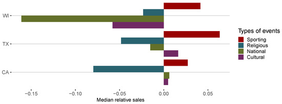 We also analyzed sales volumes during special event days versus non-event days in the three states (please see Figure 3). Our findings suggest that special events slightly outsell non-event days in Texas before 2014, while afterward, their sales are similar. In California and Wisconsin, there is a drop in sales around the same time, but here it is from similar sales to lower sales. This pattern appears to be common, starting from 2013. Our analysis of event types is particularly interesting, especially for Wisconsin, where national events result in a considerable adverse effect on sales figures (Figure 4). Additionally, Wisconsin stands alone as the sole state where cultural events experience lower sales figures, particularly when compared to Texas. On the other hand, religious events show a relatively minor but still unfavorable effect in Wisconsin, while sporting events have positive impacts in all three states.