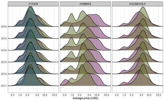 The “Everyday Low Prices” policy has been a key driver of Walmart’s success, helping the company to establish a strong position in the highly competitive retail industry. The idea behind this policy is to provide customers with affordable pricing on a wide range of products throughout the year, rather than relying on the typical retail model of offering higher prices and occasional sales. By maintaining low prices every day, Walmart aims to attract and retain customers who value affordability and reliability in their shopping experience. Figure 5 depicts overlapping density plots for weekly average price distributions within each category’s departments for each year from 2011 to 2016. As expected, the price distributions have remained relatively steady, experiencing only slight increases, likely attributed to inflation. However, distinct variations exist among the categories. On average, Foods items tend to be more affordable compared to Household items, whereas Hobbies items exhibit a broader range of prices, even displaying a secondary peak at lower price points. Within each category, there are also substantial differences. For instance, in the Foods category, department 3 (Foods3 in dark green) does not have a high-price tail. The Hobbies category exhibits the greatest diversity, with both departments displaying wide-ranging distributions. The Hobbies2 department (depicted in light green) showcases a bimodal structure, encompassing almost all items priced below USD 10, whereas the Hobbies1 department (in pink) exhibits notably higher prices. The price distributions in the Household category are quite similar, but the Household2 department (in light green) has a peak at clearly higher prices than the Household1 department (in pink). An interesting trend is visible in the Hobbies2 department, which becomes increasingly bimodal over time. The second peak at USD 1 is growing in importance, almost reaching the level of the main peak just above USD 2. Meanwhile, the small secondary peak at half a dollar in the Hobbies1 department (in pink) becomes flatter after 2012. Conversely, the Household departments remain very stable, while the Foods category shows small changes such as the relative growth of the USD 1 peak in the Foods1 department.