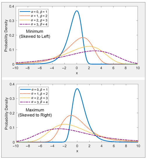 The extreme value distribution Type I (EVI), or Gumbel’s distribution, was introduced by Gumbel [11]. It is used in hydrology for predicting extreme flood frequencies and rainfall rates. It also has a significant role in econometrics in modeling extreme changes in stock prices and interest rates [26,27]. The probability density function (PDF) of the Gumbel distribution has two cases: the maximum (skewed to the right distribution) or the minimum (skewed to the left distribution), as shown in (1) and (2), respectively.