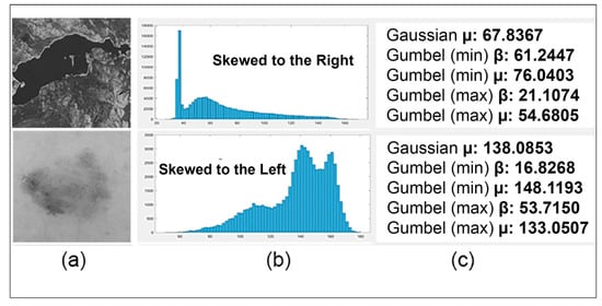 In general, images can have various forms of intensity distribution depending on their original structure. In remote-sensing applications, optical imagery of water bodies has been used on regional and global scales for water mapping [5]. Such optical images, including the water body’s surface, can have right-skewed histogram distributions, and these images typically include rivers and lakes with variations in intensity that are shaped by seasonal conditions [6]. On the other hand, left-skewed distributions appear in some images’ histograms, e.g., in special cases in medical images such as those of dermoscopic skin lesions and other types of images. For instance, in some medical images, the skewness of a histogram can be influenced by factors such as the image acquisition parameters. When Magnetic Resonance Imaging (MRI) a brain, the segmentation task is affected if the intensity dissimilarity between adjacent glioma regions is small; this challenge was solved using U-Net to propose attention layers for small-intensity dissimilarities [7]. Moreover, Computed Tomography (CT) scan images can indeed vary depending on multiple factors, including the stage and type of infection, while the proportion of infected pixels in CT images is small [8]. Images of these kinds often present similar segmentation challenges, particularly when employing mean-based thresholding techniques while adhering to the Gaussian definition for a mean estimation [9]. The performance of mean-based thresholding methods in achieving superior segmentation results can be influenced by the choice of the probability distribution. For instance, the Gaussian distribution tends to perform optimally when dealing with symmetric intensity levels, whereas the utilization of the log-normal distribution can lead to improved mean estimations in cases involving right-skewed intensity levels, ultimately enhancing the effectiveness of mean-based objective functions [10]. However, Gumbel maximum and log-normal distributions do not necessarily have the same mean value, even for a right-skewed histogram. The mean value of a probability distribution is a measure of its central tendency and it can vary depending on the specific parameters of each distribution. The novelty of using the Gumbel distribution and Maximum Likelihood Estimation (MLE) lies in their ability to address these limitations effectively. Mitigating these limitations refines the thresholding function, improving the precision of image segmentation and target object detection, particularly in medical imaging and remote sensing.