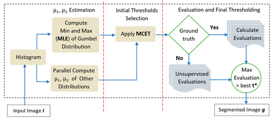 Other distributions, such as gamma, log-normal, and Gaussian distributions, are employed to represent related works in this context. After the threshold selection process, the evaluation and final thresholding can be achieved using either ground truths present for the segmented images or, if ground truths are missing, unsupervised evaluation, as explained in Section 4.