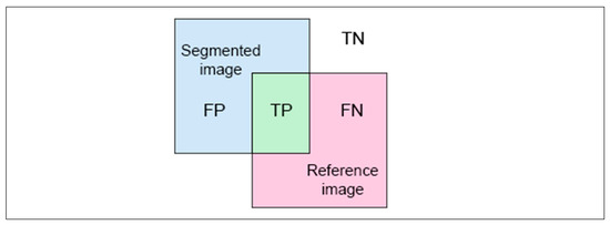 This evaluation is dependent on the corresponding references for the segmented images such that it reflects the matching approach between the segmentation result and the required ground truth [33,34,35]. This evaluation uses specific measurements for pixels classified based on their regions, TN, TP, FP, and FN, as shown in Figure 4.