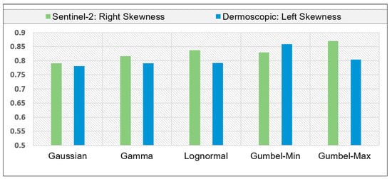 As can be noticed in Figure 5, the proposed method has two main objective contributions in segmenting images with skewed histograms compared to related works. Using MCET with the maximum case of the Gumbel MLE showed obvious improvements over related works in segmenting Sentinel-2 Satellite images that demonstrate skewness to the right in their histograms; this applies to the concept of using the maximum Gumbel distribution case with right-skewness samples. Similarly, it is also noticeable that using MCET with the minimum case of the Gumbel MLE showed an improvement in segmenting dermoscopic skin lesion images that demonstrate skewness to the left in their histograms; this applies to the concept of using the minimum case of the Gumbel distribution with the left-skewness samples.
