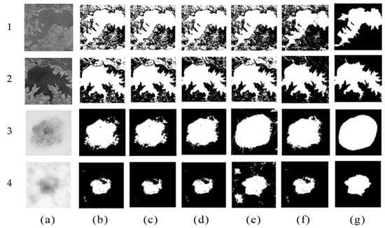 Selected samples: (a) original images, 1 and 2, Sentinel-2 satellite water bodies, and images 3 and 4, dermoscopic skin lesions; (b–f) segmented images using MCET based on the Gaussian [3], Gamma, log-normal [25], Gumbel minimum, and Gumbel maximum, respectively. (g) The corresponding ground truths for the images in column (a).