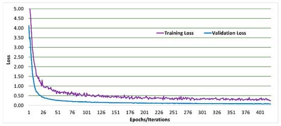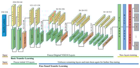 Large-scale visual data classification is usually performed using VGG16 and VGG19 CNN architectures. VGG16 is a CNN that could be combined with transfer learning for the classification process []. VGG16 is divided into three parts: convolutional layers which utilize filters for feature extraction from images, pooling layers for reducing spatial size, thereby decreasing the number of parameters and computations, and fully connected layers for final classification. When combining VGG16 with transfer learning, the model is expected to become more accurate, faster, and require less training time. This is a result of the fact that VGG16 is already pre-trained on large datasets and thus can detect particular features. Transfer learning allows leveraging the VGG16 pre-trained weights thereby increasing efficiency.