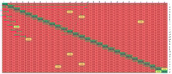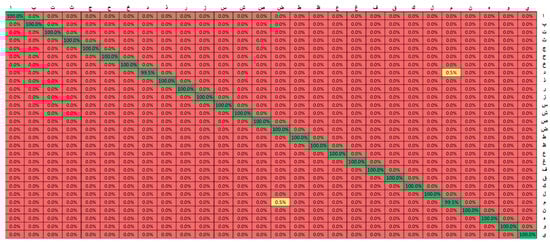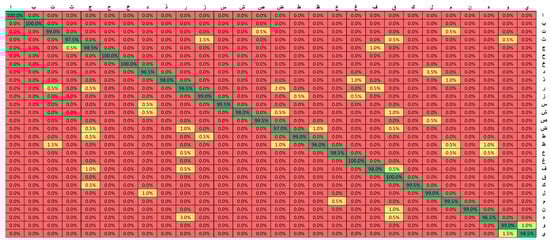 The confusion matrix-based comparison obtained for the various experiments performed above with the best-performing VGG16 model is shown in Figure 17, Figure 18 and Figure 19. These are the confusion matrices for the experiments performed on the Arabic braille language dataset. Figure 17 shows the confusion matrix for the basic VGG16 applied to the Arabic braille language dataset. It is noticed that even with the basic VGG16, the accuracy is high but it can be optimized to achieve better results because the application we are targeting is for the specific purpose of assistive learning technology for the visually impaired. Thus, an optimal solution can only be achieved as we approach approximately 100% on various complex datasets of the Arabic braille language dataset. Figure 18 shows the confusion matrix using the Optimized VGG16 model with the proposed transfer learning approach. It is noticed that the confusion matrix showed better results but still can stand for improvement for the optimal solution. Therefore, Figure 19 shows the confusion matrix using the optimized VGG16 along with the proposed transfer learning approach, which resulted in a further increase of accuracy.
