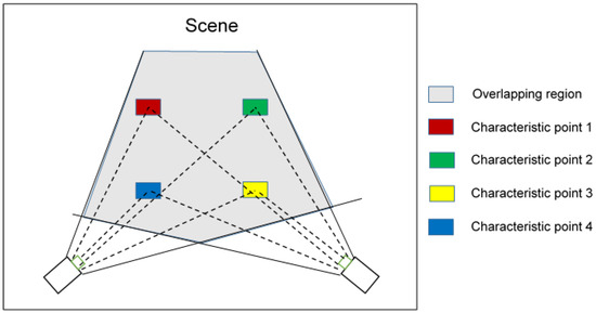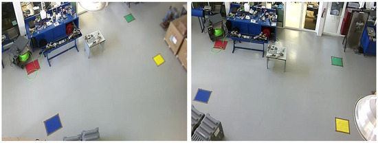 To map the spaces generated by each camera to the common global space, several common points, which were defined as active marks, were installed (rectangles: red, yellow, green, and blue), as shown in Figure 2.