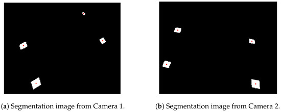 Segmentation of the perspective images. In the binary images, the white color represents the colorful block (Figure 2), and the red dots represent the centroid of each block.