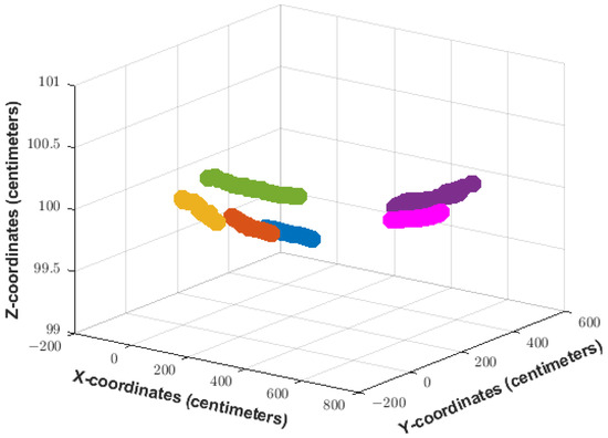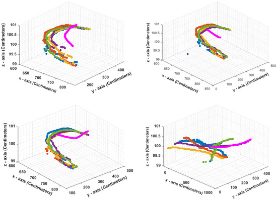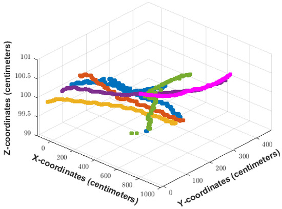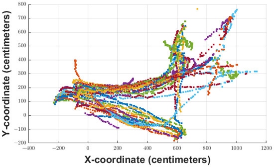 Figure 6 shows the 60 trajectories used that were found in the videos. The scale goes on the “x” axis from approximately −200 cm to 1200 cm and on the “y” axis from −200 cm to around 800 cm. To be able to provide feedback through augmented reality, a 3D space is required; for this reason, and due to the equivalences on the “x” and “y” plane, the “z” axis was defined with a height constant of 100 cm. This is because what is analyzed in the present work is the dynamics generated by objects in motion on the planes of “x” and “y”.