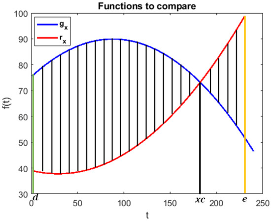 Suppose we have two trajectories, g and r, for which we want to calculate similarity using the proposed metric. If we take one of the components of each path on the same axis, we have and , which are defined by a second-order polynomial like and .