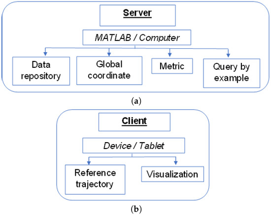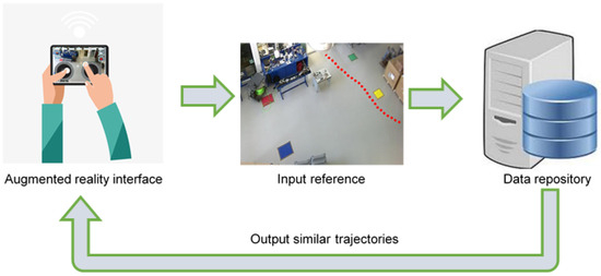 The application was developed in Unity3D, where all the trajectories of the moving objects were mapped to global space. Figure 7 shows, in a general way, how the application works. First, the reference trajectory was created in global space, as shown in Figure 8, and then the trajectory information was sent to a central unit that contains the data repository of the homogenized trajectories. In the same main unit, all the processing was carried out to calculate the similarity between the trajectories and to send the resulting information back to the application for viewing in the space where the information was acquired, that is, a client–server model was generated to send the data from the application to the central unit in both directions.
