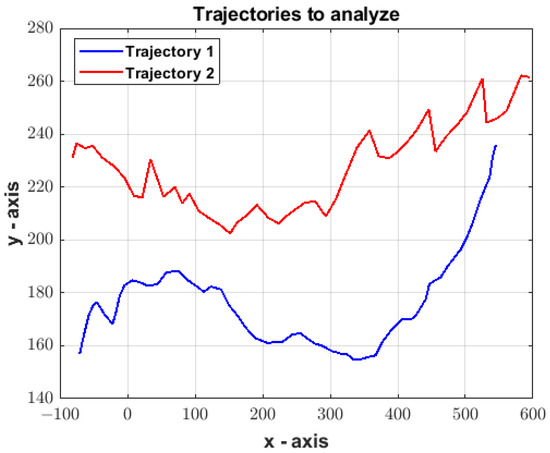 The proposed similarity measure is suitable for analyzing the trajectories of moving objects found in a scenario from which information is acquired through one or more sources of information (cameras). In these scenarios, the curves are smooth and can be well-fitted by a low-order polynomial. Let us define a trajectory of a moving object as , where each represents the centroid of the defined object as . Parametric curves can model this trajectory as follows: