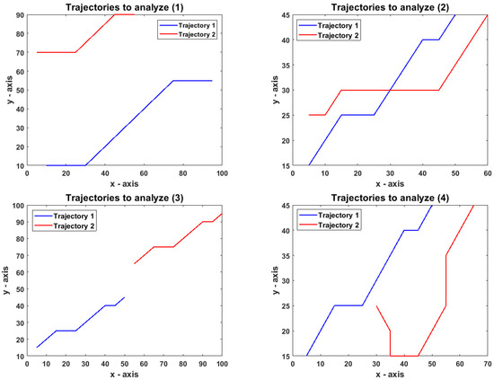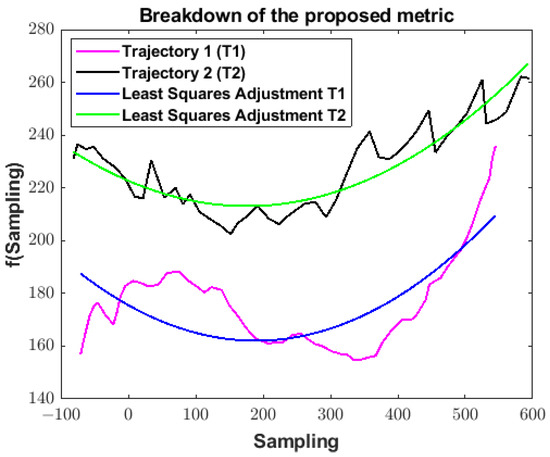 The metric takes the data in domain , subtracts for all components, and takes the absolute value. The proposed metric has its domain in , but the difference is the sense of instantaneous change, which coincides with the differences in the behavior of the trajectories. In this sense, metric can be seen as a particular case of the proposed metric when a first-order polynomial function represents the trajectories.