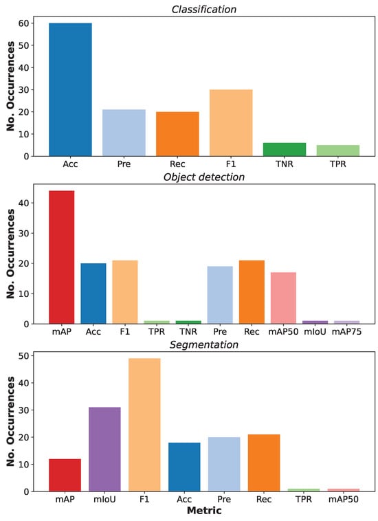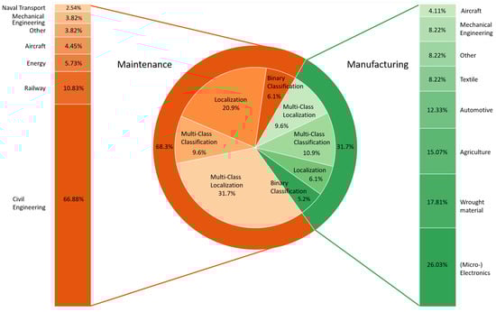 There are many different industry sectors that apply AVI in maintenance and manufacturing. In maintenance, the clear majority (66.88%) of publications are from the civil engineering sector, while, in manufacturing, the distribution of a similar total share is more even, with 26.03% from (micro-) electronics, 17.81% from wrought material production, 15.07% from agriculture, and 12.33% from automotive. This may be due to the fact that many manufacturing applications were already targeted for automation with classic CV, as the environmental conditions that affect image quality, as well as variance, are easier to control, so the expected process improvements were generally lower. Most maintenance use cases are performed outdoors in varying light, weather, and seasonal conditions. Therefore, DL-based CV was needed to address use cases in the civil engineering or railway sector, such as bridge, road, or building facade inspection, as well as rail surface, fastener, or catenary inspection. Looking at the preferred AVI tasks, we see a clear majority of 77.01% for localization in maintenance, while, in manufacturing, the shares of classification (50.47%) and localization (49.53%) are evenly split. The reason for this is that, in maintenance, it is usually necessary to assess a whole system with many different parts, so the need for localization arises, while, in manufacturing, it is easier to limit the inspection to individual parts, which is also possible with classification.