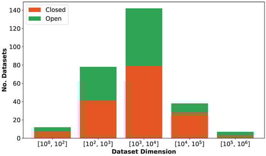 The dataset dimensions vary from 45 images [48] to more than 100,000 images [81,94,183,231], with the average number of images at 14,614 and a median of 1952. Figure 7 visualizes the number of datasets grouped by the decimal power of their dimension, ranging from less than 100 to less than 1,000,000. The two largest groups cover the intervals [101, 1000] and [1001, 10,000], with most of the datasets tending toward the lower boundary of their respective group. These two groups also feature the most open-access datasets: in total, 77/243 (31.69%) of the papers used at least one open-access dataset.