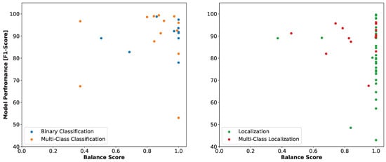 The first thing that stands out for the localization tasks depicted in the right graph is the accumulation of (binary- or single-class) localization datasets with a balance score of one. This is primarily attributable to the fact that it is seldom specified whether and how many images without inspection targets are contained in the datasets, specifically for segmentation. The general correlation between class balance and performance is visible as well, but the gradient of an imaginary regression line would be slightly lower compared to classification. This can be explained by the higher resilience of localization models to dataset imbalance based on the property that there are generally fewer areas of interest or foreground in an image than background, and in this task, they have to be explicitly marked.