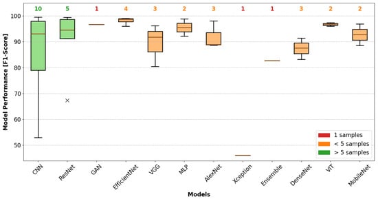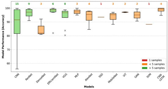 Table 3 presents an overview of 42 publications that solve various use cases of AVI through multi-class classification and the models that are used to solve them. The models used to solve these use cases include popular DL architectures such as AlexNet, CNN, DenseNet, EfficientNet, GAN, MLP, MobileNet, ResNet, single-shot detector (SSD), and VGG. Twenty-one publications describe approaches for damage detection, of which six approaches are based on custom CNNs. The other four authors used ResNet-based architectures. Kumar et al. [85] proposed an MLP architecture to perform damage detection. Also, an EfficientNet and a single-shot detector (SSD) were employed for multi-class damage detection. Five publications cover crack detection use cases. For example, Alqahtani [86] used a CNN, and Elhariri et al. [87] as well as Kim et al. [88] used a VGG. Also, DL models like ResNet, DenseNet, and an ensemble architecture are proposed by some authors. Completeness checks were performed with the help of a ResNet by Chandran et al. [51] or an SSD, as shown by Yang et al. [89]. In seven publications, the authors used custom CNNs, DenseNet, ResNet, or VGG in quality inspection use cases. Also, other use cases can be addressed by different DL-based CV models or MLPs.