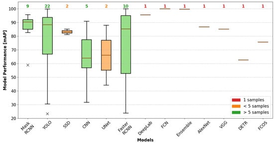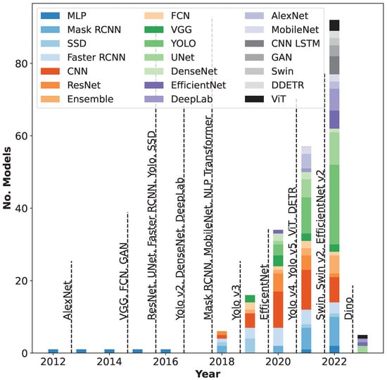 In the following subsections, one for each AVI task, we investigate the collected literature and utilized models. Only the best-performing architecture is mentioned if multiple are utilized. Models that are derived from established base architectures like Residual Networks (ResNet) [67] are still considered to belong to that architecture family unless they are combined or stacked with another architecture. We also subsumed all versions of the “you only look once” (YOLO) architecture [68] under YOLO. Models that are custom designs of the authors and not based on any established architectures are subsumed under the categories multi-layer perceptron (MLP), convolutional neural network (CNN), or Transformer based on their main underlying mechanisms.