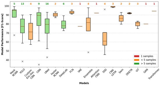 As previously mentioned, localization is used to detect where an object of interest is located. Table 4 summarizes which VI use cases are addressed with localization and the appropriate models. In a total of 50 publications, localization was employed for AVI. Contrary to classification approaches, crack detection is the most addressed VI use case, with a total of 26 publications investigating it. The most utilized approach for crack detection is the CNN, which was applied in eight publications. Furthermore, in three other publications, extended CNN architectures were used. Kang et al. [120] introduced a CNN with an attention mechanism, and Yuan et al. [121] used a CNN with an encoder–decoder architecture. Andrushia et al. [122] combined a CNN with a long short-term memory cell (LSTM) to process the images recurrently for crack detection. Among custom CNN approaches, six authors used UNet to detect cracks, mostly in public constructions. Damage detection via localization occurred 16 times and was addressed with at least twelve different DL-based models. Three authors decided to approach it with DL-based models of the Transformer family. For example, Wan et al. [123] utilized a Swin-Transformer to localize damages on rail surfaces. Completeness checks can be executed with YOLO and/or regional convolutional neural networks (RCNNs). Furthermore, YOLO can be used for vibration estimation, as shown by Su et al. [124]. Oishi et al. [125] proposed a Faster RCNN to localize abnormalities on potato plants.