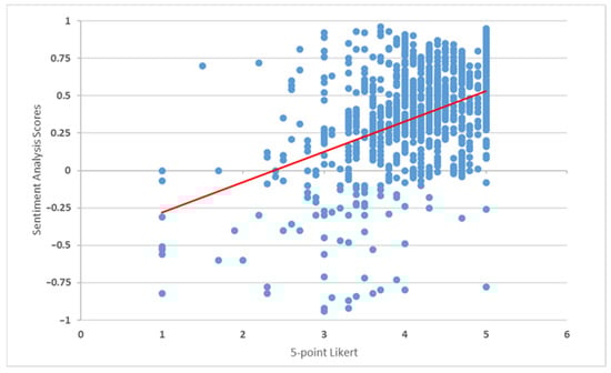 p value < 0.01). This finding indicates a robust agreement in sentiment scores and the Likert ratings assigned by students to their academic advisory interactions. It suggests that the sentiment analysis scores align closely with the reported Likert ratings, indicating that the sentiment analysis effectively captures the sentiments and perceptions of students regarding academic advisor–student interactions. This validation supports the utility and reliability of our approach in quantitatively assessing student sentiment and feedback.