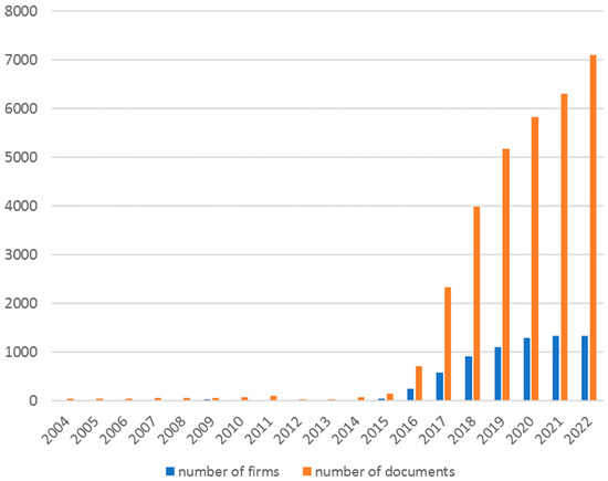 There are three data acquisition points. First, data collection began in 2016. Annual/quarterly reports were digitalized since Japan’s fiscal year ended in March 2004. However, after organizing the data, we found that the quantity of data for the period 2004–2015 was relatively small (792 documents for the 10 years) (Figure 1). Therefore, we chose 2016 as the starting point. Second, the end of data collection was December 2022. It has been argued that generative AI, which began to spread since mid-2022, may have a qualitatively different impact on society than previous AI technologies [41,42]. Third, the present study uses the calendar year, whereas Japanese firms submit their annual/quarterly reports using the fiscal year, mostly April to March. This is because annual/quarterly reports are written considering subsequent events and social contexts that occur after the fiscal year end until disclosure.