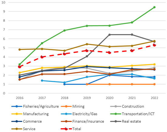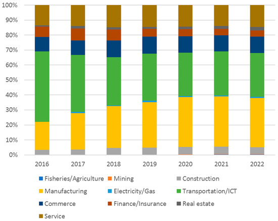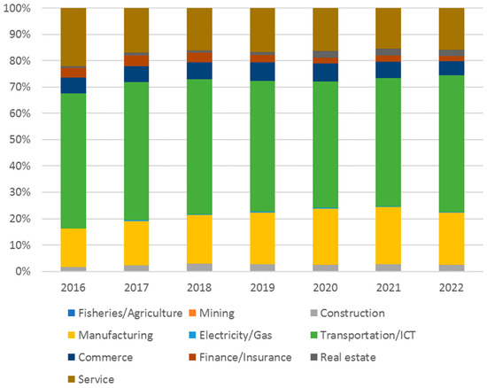 Figure 3 shows the percentage of documents mentioned by industry. Three industries, transportation/ICT, manufacturing, and services, account for approximately 85% of the total data. The remaining seven industries represent approximately 15% of the total. The data breakdown indicates that the transportation/ICT industry accounts for more than 50%, the manufacturing industry has increased to approximately 20% since 2016, and the service industry represents approximately 15%, indicating that the proportion of these industries has remained stable.