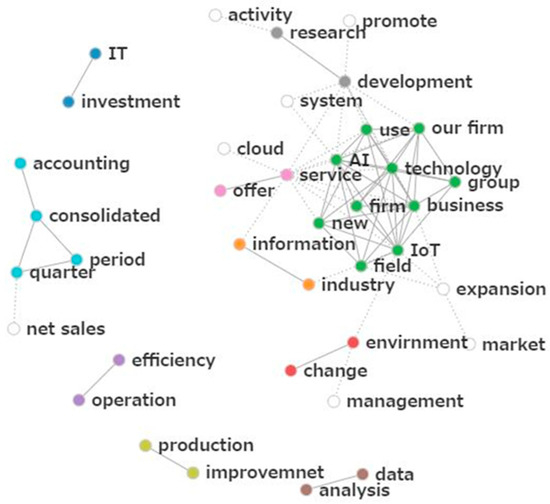 Figure 6 shows the results of the co-occurrence network analysis using data from all industries for all time periods. The words are divided into several groups. The overall result indicates that during a changing business environment (red), a group uses AI to conduct new business (green) in the information industry (orange). We aim to analyze data (brown), conduct R&D (gray), provide new services (pink), improve operational efficiency (purple), and increase productivity (yellow). As a result, they achieved financial results in consolidated accounting (light blue).