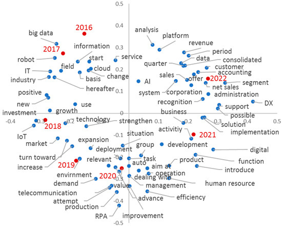 Figure 7 demonstrates the correspondence analysis results for the entire period, starting from the second quadrant in 2016, moving counterclockwise, and reaching the first quadrant in 2022. The period 2016–2017 was surrounded by important future technologies related to “big data”, “cloud”, and “robots”; thus, this period is categorized as the recognition stage. Meanwhile, 2018 is more closely associated with the terms “new”, “growth”, “positive”, and “investment”. It is now considered that AI has been recognized independently among related technologies and has become a unique area to invest in; thus, this period is called the investment stage. The period 2019–2020 is the stage of incorporation into strategy; accordingly, the terms “environment”, “expansion”, and “increase” are mentioned in 2019, whereas “management”, “group”, “value”, and “deployment” dominate in 2020. This indicates that the perception of AI evolved to be integrated into business strategies in response to the environmental change underlying AI expansion. A group response policy is evident. Simultaneously, the terms “operations”, “RPA”, “production”, and “efficiency” are close to one another. Accordingly, it can be stated that AI technology will be used to improve production efficiency to achieve AI-related strategies. This period is called the strategization stage.