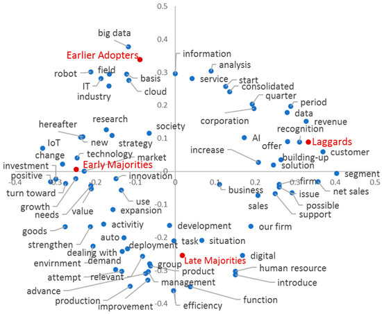 Figure 9 shows the results of the correspondence analysis based on innovation theory. Figure 7 and Figure 9 appear similar, however while Figure 7 samples the text of all firms in a given year, Figure 9 uses only the text of firms in each adopter category. Accordingly, four categories are proposed: earlier adopters, early majorities, late majorities, and laggards. Earlier adopters recognized AI as a related technology, such as “big data”, “IT”, “cloud”, and “robotics”. The early majorities focused on the future prospects of “investment”, “growth”, “aggressiveness”, and “change”. Meanwhile, the late majorities preferred to focus on “management”, “groups”, “human resources”, “operations”, and “efficiency”, which are management functions. The laggards in 2022 mostly mentioned accounting terms, such as “revenue”, “segment”, and “sales”, in addition to the marketing-related terms “customer”, “build”, and “solution”. In other words, the focus of participants shifted to technology awareness (earlier adopters), future investment (early majorities), group strategies and applications (late majorities), and marketing and accounting (laggards). This flow is similar to the stages of AI perception depicted in Figure 8.