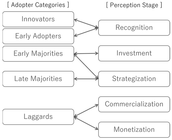 The second contribution is Rogers’ theory of innovation. Innovation theory classifies the five adopter categories, each with a unique mindset. For example, innovators are the first to adopt innovations because they prefer to take risks, whereas laggards are the slowest because they value tradition. The five-stage model in this study reveals intermediate perceptions between these adopter characteristics and actual behavior. Figure 10 is a modification of Figure 8 that incorporates the adopter categories.