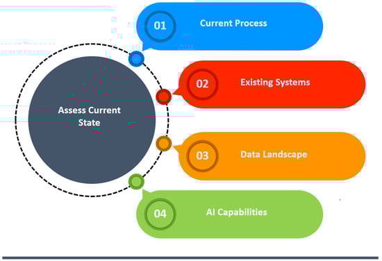 Assessing an organization’s current state for AI-based digital transformation is a complex endeavor that demands a systematic and multifaceted approach. This approach involves the integration of various methods and techniques tailored to the organization’s specific context and goals. By systematically integrating these methods and techniques, organizations can gain a holistic view of their current state in relation to AI adoption. In the development of our holistic guidelines for assessing an organization’s current state for AI-based digital transformation, we meticulously crafted a framework encompassing four essential components: current process, existing systems, data landscape, and AI capabilities. Each element plays a pivotal role in evaluating an organization’s readiness for AI integration, ensuring a comprehensive and informed approach to digital transformation. This comprehensive understanding forms the foundation for the informed decision making, strategic planning, and successful implementation of AI-based digital transformation initiatives. It is essential to provide a baseline to comprehend the organization’s readiness for transformation, ensuring the effective planning and execution of AI strategies [24,25]. Figure 2 depicts the elements of the current state assessment. It allows organizations to assess their AI readiness, thus enabling the strategic allocation of resources for AI initiatives [26]. Here, there is a deeper exploration of the systematic approach that encompasses diverse methods and techniques in terms of the elements of current state assessment: