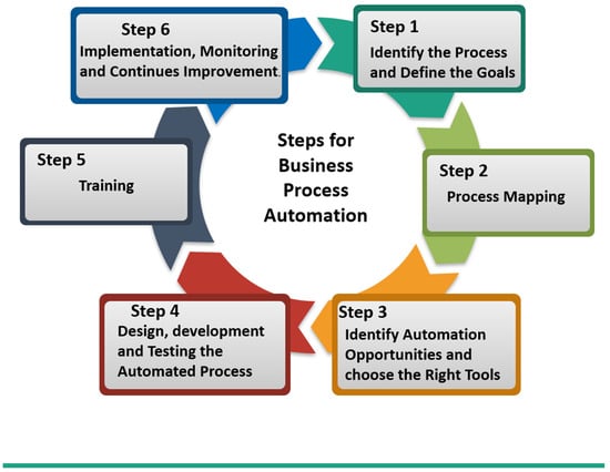 - Once the process has been mapped, identify which parts can be automated. It is important to consider which steps will yield the most benefit from automation because not all steps may be suitable or beneficial to automate [41]. Depending on the complexity of the process and business needs, the automation tool can vary. Tools can range from simple task automation software to more complex business process management (BPM) or robotic process automation (RPA) tools [42].
