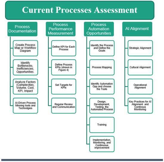 It is essential to have measures in place that accurately reflect the performance of the current processes. Key performance indicators (KPIs) should be defined for each process, capturing aspects such as the processing time, error rate, cost, and customer satisfaction. Tracking these metrics over time provides a performance baseline and can highlight areas where AI could add value [30]. This involves the identification and tracking of KPIs for individual processes, offering a quantifiable means to assess their operational performance and quality [30]. It can help identify areas of inefficiency, bottlenecks, or underperformance that could be addressed through automation, optimization, or redesign. Furthermore, this serves as a basis for the post-implementation comparison of AI solutions, making it possible to quantify the benefits of digital transformation in operational terms [31]. Various metrics may be employed. Common metrics include the cycle time, error rate, cost per transaction, process velocity, and customer satisfaction. It is increasingly common for businesses to use AI and data analytics tools for real-time process performance monitoring and analysis [32]. However, it is important to use relevant and balanced metrics to avoid creating unintended consequences. For instance, an overemphasis on speed might lead to a compromise in quality. Therefore, organizations must select metrics that provide a balanced view of the process performance [33].