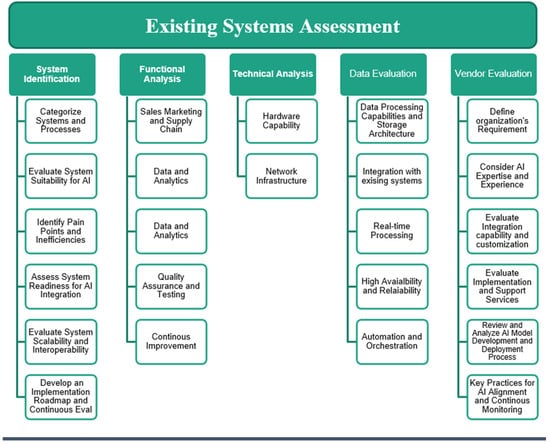 Examining the existing technology infrastructure is critical to gauge an organization’s technological readiness for AI deployment [60]. This understanding can help identify the required changes in the IT infrastructure and guide the strategic selection of AI tools and technologies. It serves as the foundation for understanding the current technology landscape, which includes hardware, software, data storage, and processing systems. Figure 6 shows the Steps for existing systems assessment.