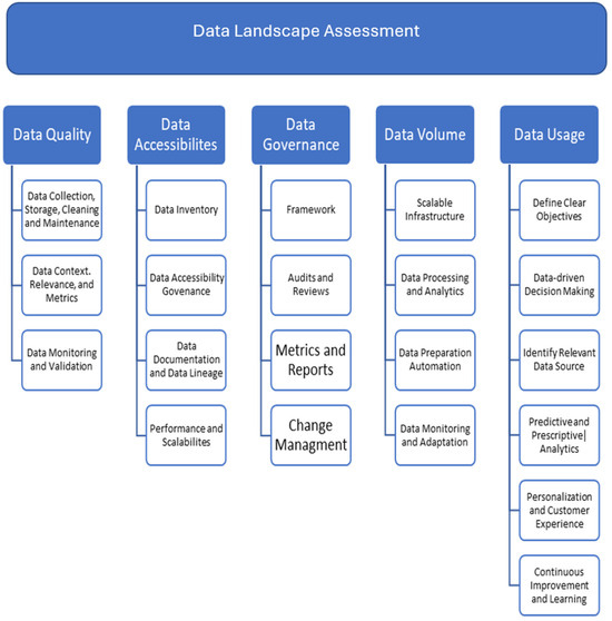 Data are the lifeblood of AI. Understanding the type of data that are collected, how they are stored and managed, and their use in decision making constitutes a crucial part of the current state assessment [62]. Data quality, governance, privacy, and security are the key considerations in this regard. The assessment of an organization’s data landscape is a complex process that encompasses several key facets, as outlined below.