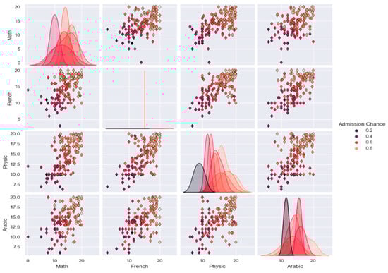 During the data analysis, we examined the relationship between admission chances and various academic features such as the grades for math, French, Arabic, and physics. We used a pair plot [49], as shown in Figure 1,to visually represent scatter plots of these features against the target variable, admission chance, which provided us with valuable insights into their correlations.