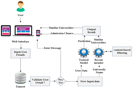 The framework is designed to analyze various data inputs, including subject grades and academic setbacks. It works principally in two distinct scenarios; the first step involves predicting a student’s chances of gaining admission into their preferred institution [30] from the available universities on the platform. In the second step, the framework utilizes a recommendation engine to suggest alternative universities [31] based on a description matching the career paths and opportunities those universities offer [32]. The recommendation option goal is to empower students by providing them with insights into similar academic opportunities at other universities, especially if their chances of admission are low at their first-choice institution.